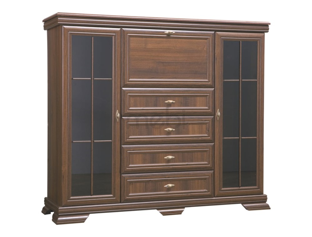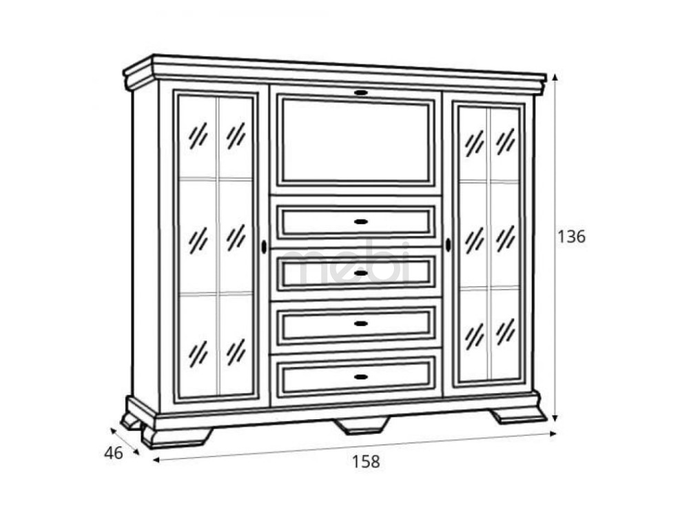 Бар Kora від Gała Meble – це продукт, який ви шукаєте. Він вражає своїми розмірами та захоплює своїм ретельно обробленим, декоративним дизайном, що випливає з класичного стилю. Барна стійка Kora складається з бічних шаф для демонстрації численних прикрас, а також висувних ящиків і шафи, що відкривається зверху, де ви можете легко сортувати аксесуари для дому. Меблі характеризуються привабливими ручками та кольором, який ідеально відображає текстуру та сучки натуральної деревини.