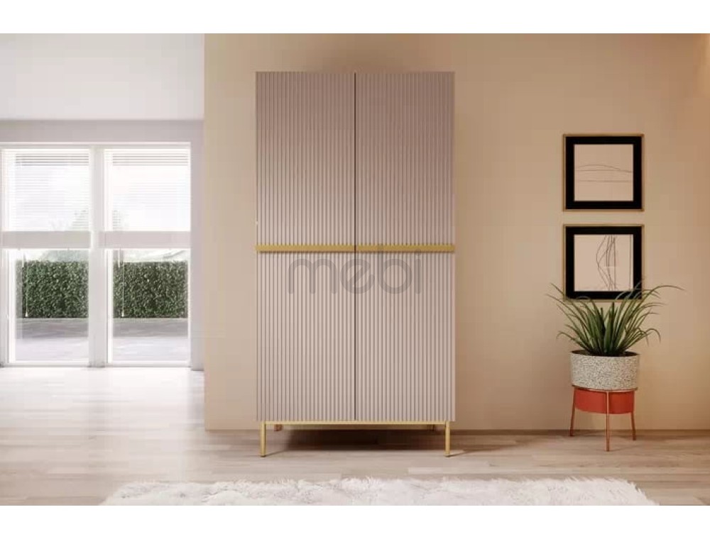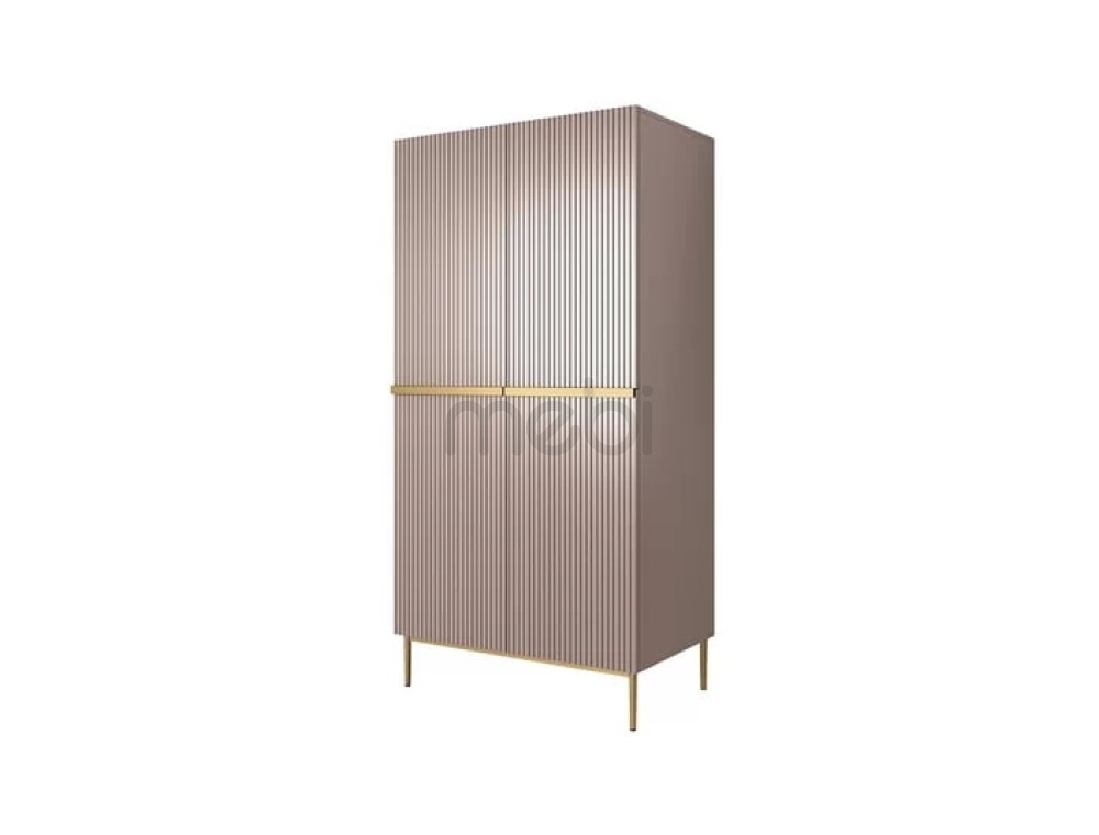 Шафа Ніколь дводверна з ємністю розміром 100х62х220 см на металевому каркасі висотою 20 см. Форма та вся колекція характеризуються сучасним дизайном, що робить її надзвичайно привабливою порівняно з іншими колекціями. Корпус і фасад шафи виготовлені з високоякісної МДФ плити, задня частина корпусу - з ХДФ плити. Всередині шафи є штанга для вішалок, полиця і контейнер розміром 48х45х50 см з двома ящиками. Дверцята шафи відкриваються металевими ручками. Високі ніжки в золотому або чорному кольорі доповнюють всю конструкцію. Під ніжками гумові накладки.