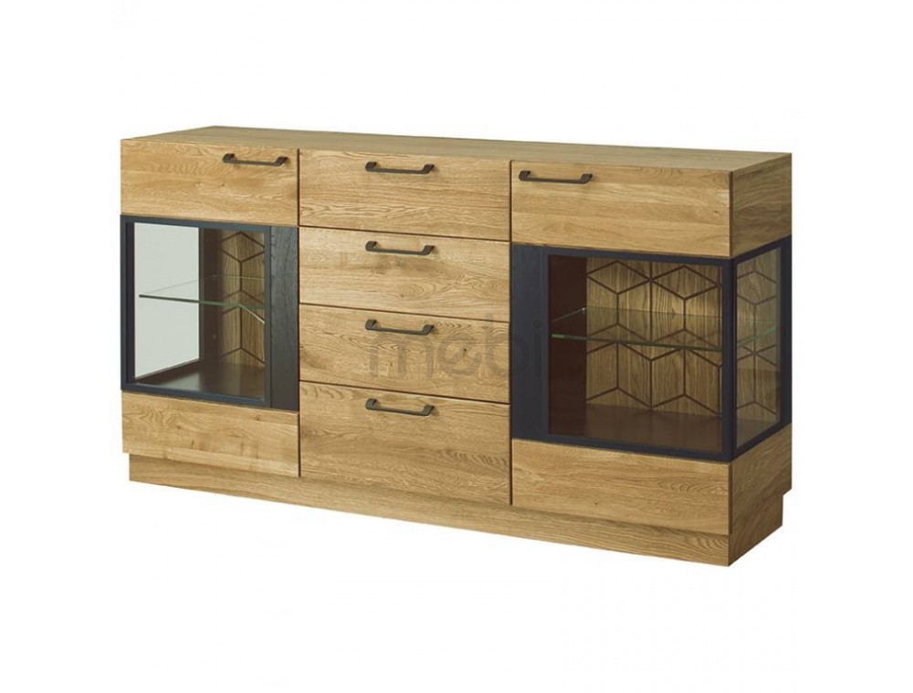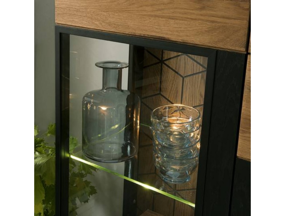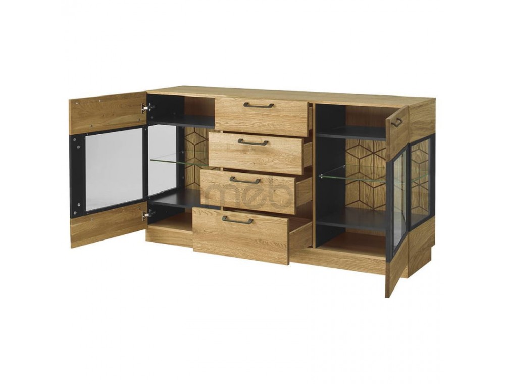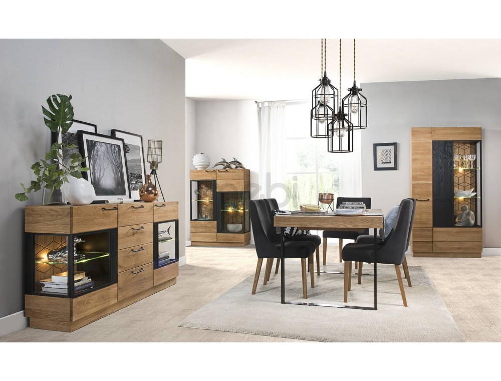 Предмет меблів, який поєднує в собі переваги вітрини, де можна виставити кілька прикрас, з комодом, ідеальним для сортування різних елементів - так можна описати комод Mosaic 47 від Szynaka Meble. 2 скляні фасади з боків містять 3 полиці, включаючи 1 видиму скляну полицю. 4 шухляди посередині можуть розмістити ваші документи. Довгасті металеві ручки чудово поєднуються з дубовим відтінком меблів і чорними матовими вставками. Верхня частина комода Mosaic ідеально підходить як вітрина для книг, сувенірів або фоторамок. Додатковою опцією є світлодіодне освітлення, яке зробить кімнату ще більш затишною та теплою.