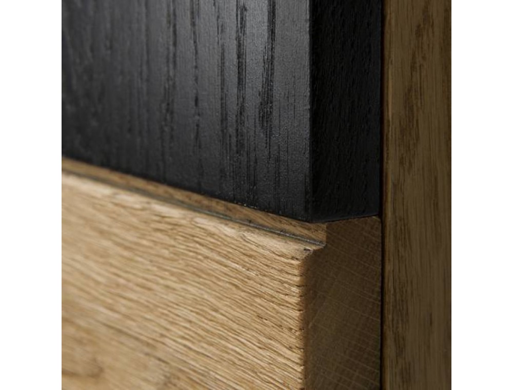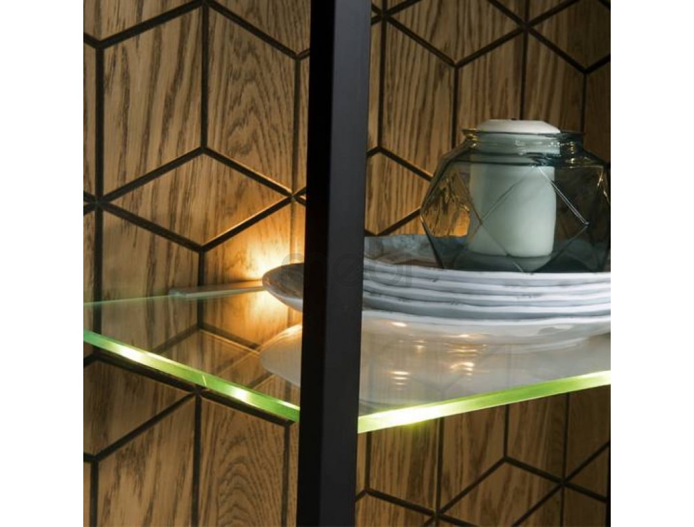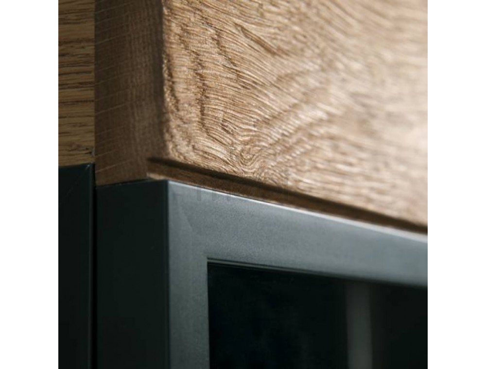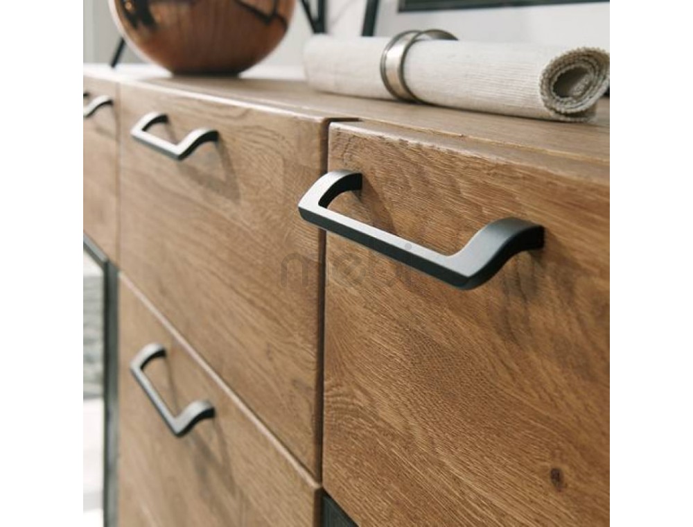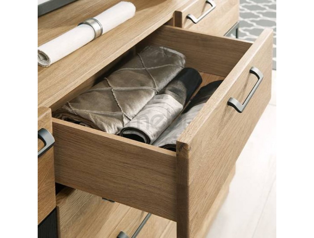 Предмет меблів, який поєднує в собі переваги вітрини, де можна виставити кілька прикрас, з комодом, ідеальним для сортування різних елементів - так можна описати комод Mosaic 47 від Szynaka Meble. 2 скляні фасади з боків містять 3 полиці, включаючи 1 видиму скляну полицю. 4 шухляди посередині можуть розмістити ваші документи. Довгасті металеві ручки чудово поєднуються з дубовим відтінком меблів і чорними матовими вставками. Верхня частина комода Mosaic ідеально підходить як вітрина для книг, сувенірів або фоторамок. Додатковою опцією є світлодіодне освітлення, яке зробить кімнату ще більш затишною та теплою.