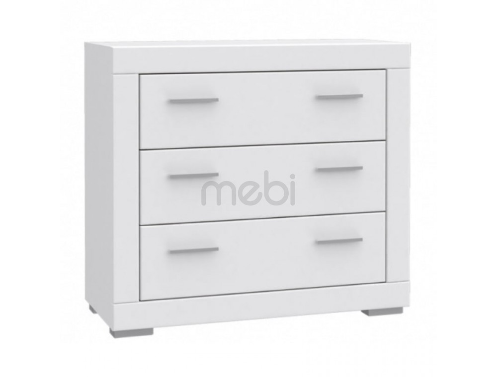 Комод Snow має 3 містких ящика, в яких можна зберігати одяг та інші дрібнички. Цей сучасний білий предмет меблів має потовщені боки, що робить його масивним. Лінійні срібні ручки відповідають дизайну ніжок. Ящики оснащені системою «тихого закривання», яка захищає комод Snow від можливих пошкоджень. Кромки ABS гарантують безпеку використання.