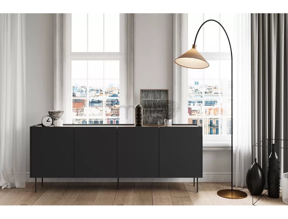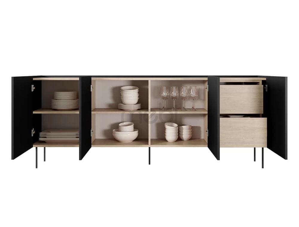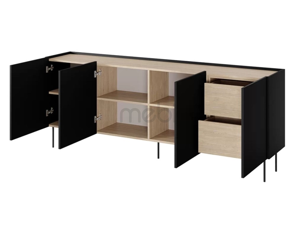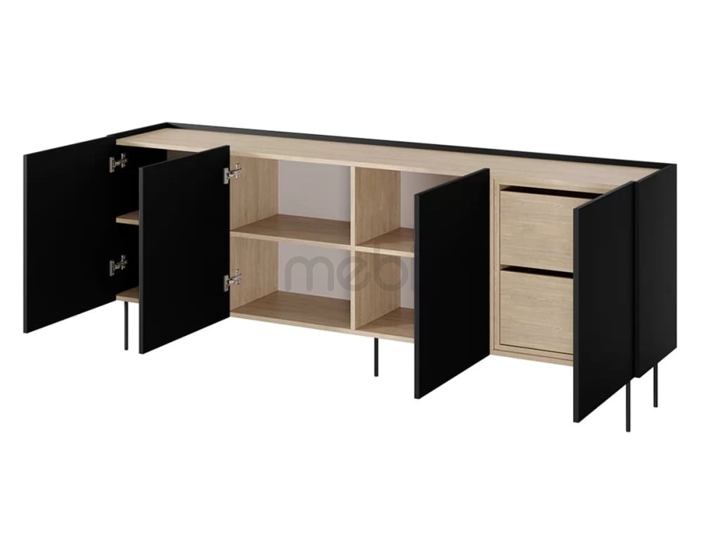Комод Desin розміром 220х85х40 см - це модель ідеальної форми для вітальні. Комод має чотири місткі тумби з 3 полицями та 2 ящиками. Корпус, передня і верхня сторони виготовлені з ламінованої плити товщиною 18 мм, а задня частина - з HDF плити товщиною 3 мм. Система відкривання без ручок із фронтальними частинами, що виступають на 2 см, збагачена чашковими петлями з тихим закриванням. Все це доповнюється металевими ніжками в колір меблів висотою 20 см.