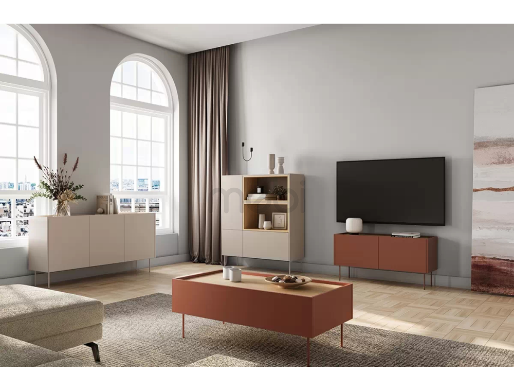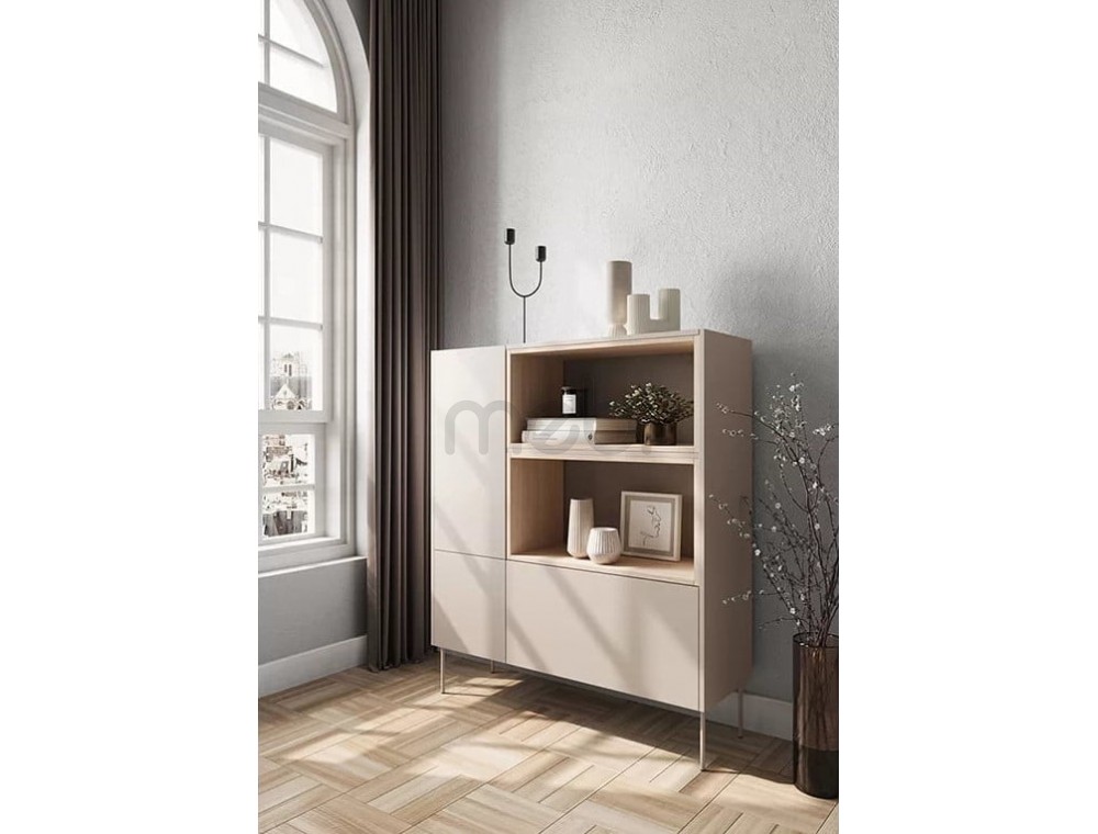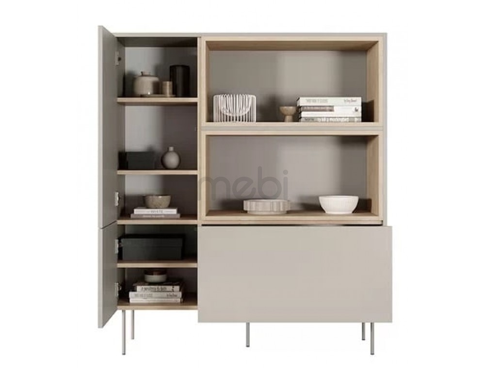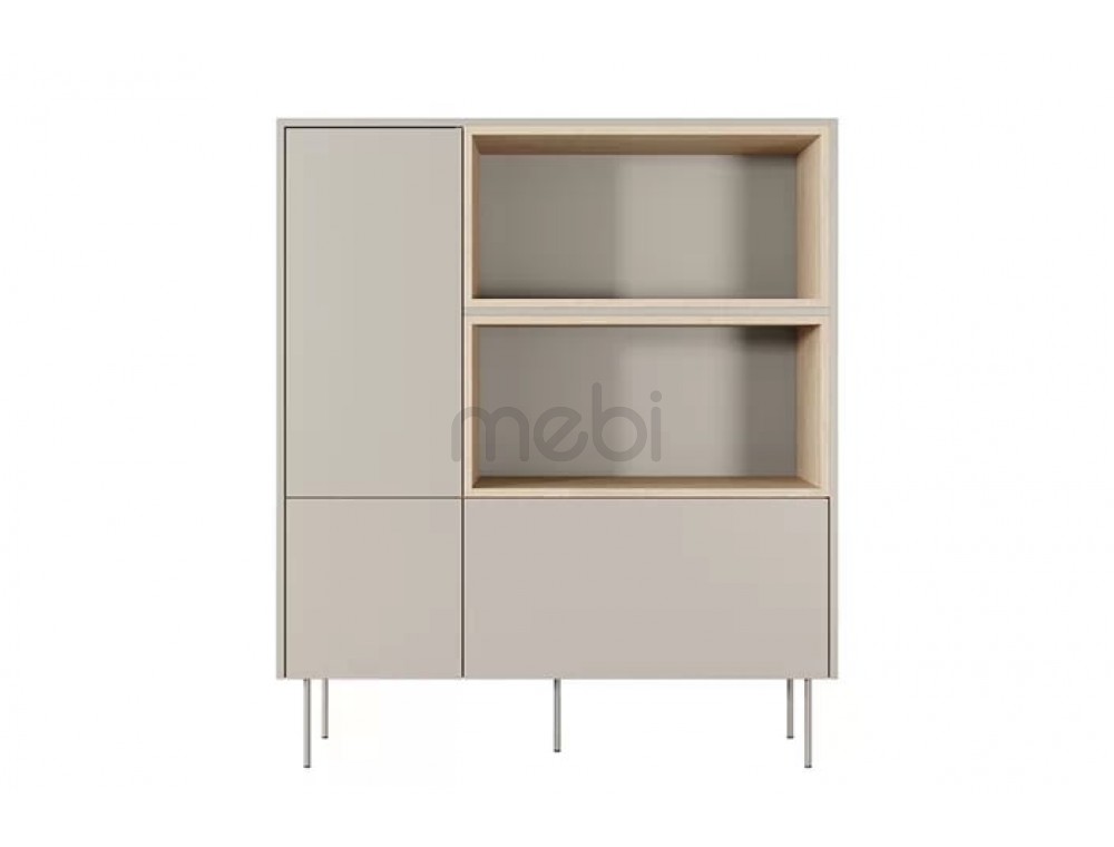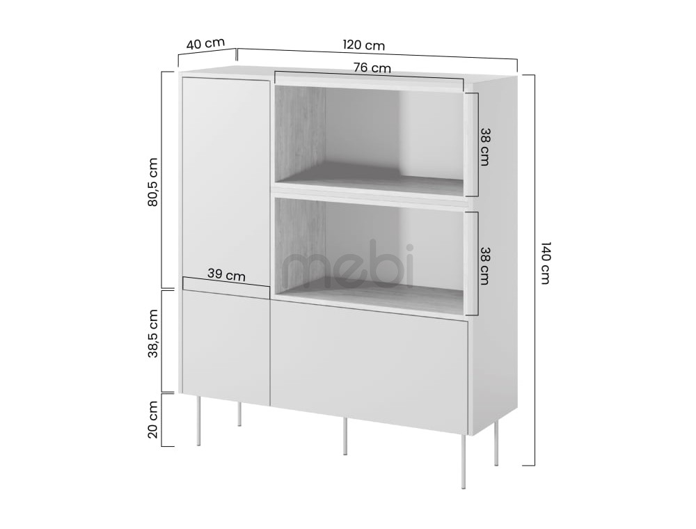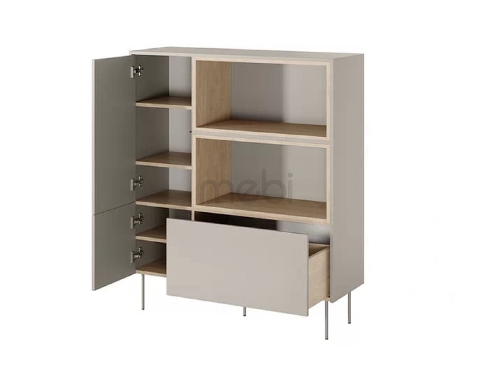 Високий комод Dizi з розмірами 120x140x40 см ідеально підійде для вітальні. Комод має містку тумбу зліва з численними полицями і відкритими полицями і глибокий ящик справа. Корпус, передня і верхня сторони виготовлені з ламінованої плити товщиною 18 мм, а задня частина - з HDF плити товщиною 3 мм. Система відкривання без ручок. Все це доповнюється металевими ніжками в колір меблів висотою 20 см.
