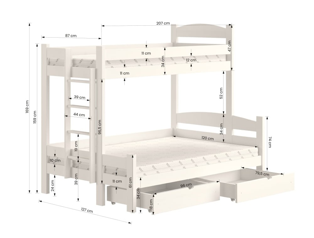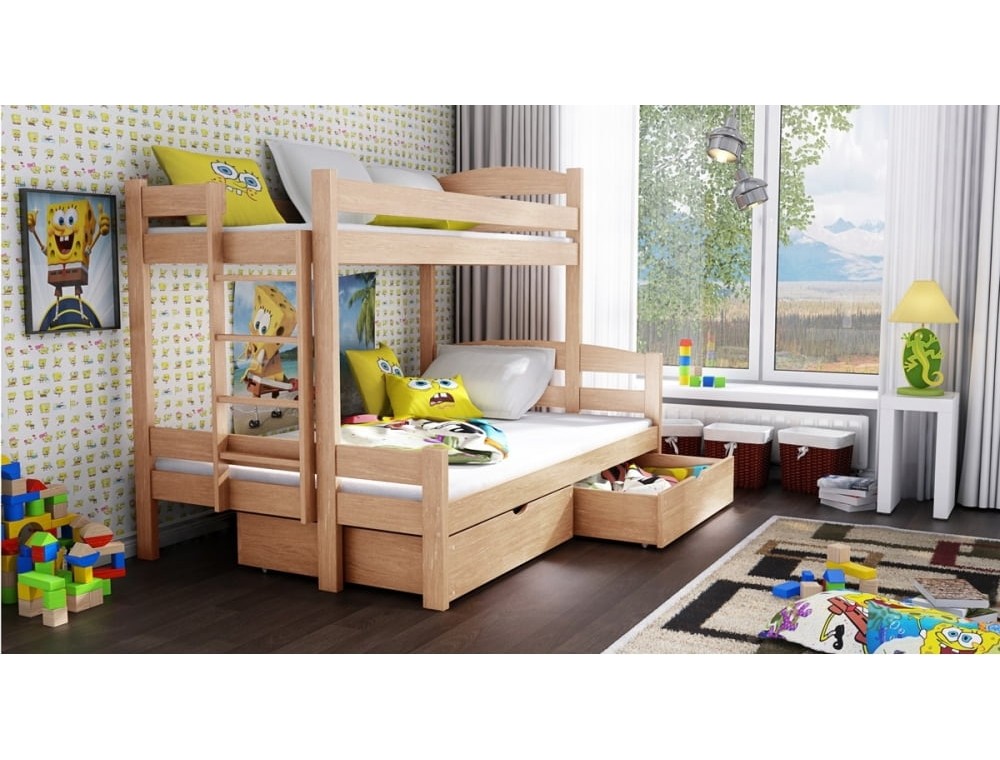 Одноярусне ліжко Lovic розміром 80х200 см має дві спальні поверхні - верхню площею 80х200 см і нижню площею 120х200 см. Модель виготовлена з масиву сосни, покрита двома шарами лаку, що відповідає європейським вимогам (напилення). У вартість ліжка входить: корпус з контейнером для постільної білизни у вигляді двох ящиків і двох каркасів. Матрац необхідно придбати окремо: - двоярусне ліжко, сертифіковане Інститутом техніки та дерева в Познані; шухляди з пластику; боковини шухляд з ламінованої плити; - виріб, покрите лаком двічі; - рекомендовано дві дерев'яні рами висота матраца 8-15 см;-відсутність з’єднань ящиків з конструкцією ліжка;-з’єднання за допомогою дерев’яних дюбелів і кріпильних шурупів;-максимальне навантаження на ліжко (голів’я та низ)-250 кг;-максимальне навантаження на ящик-30 кг;