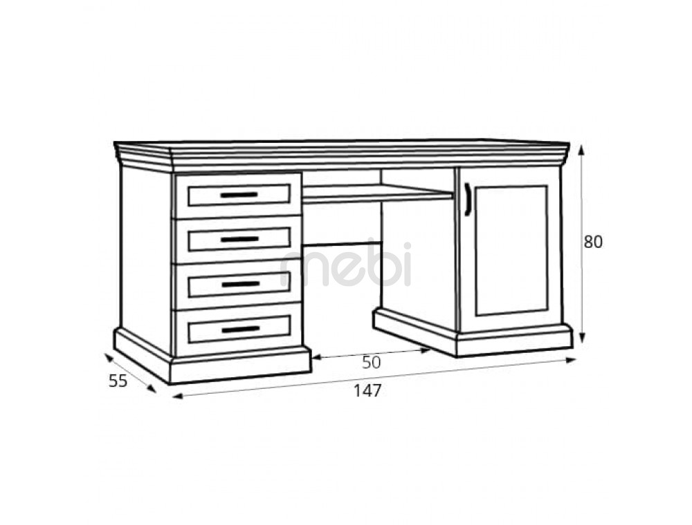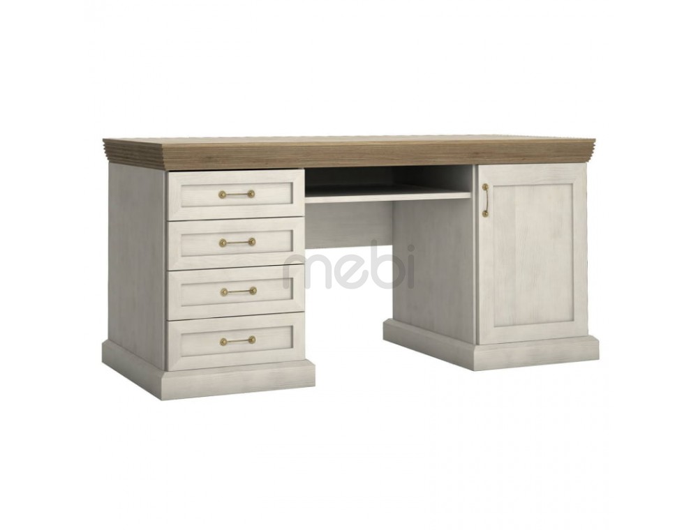 Облаштуйте свій офіс в елегантному стилі! Внесіть у свій інтер’єр письмовий стіл Royal від Gała Meble, створений за класичним каноном краси. Майстерність виконання, декоративні ручки та приємні поєднання кольорів зачарують кожного! Письмовий стіл доступний в 2 колірних варіантах. Полегшений варіант, що поєднує витончену північну сосну з масивною стільницею в декорі дикого дуба, нагадує французький Прованс. Письмовий стіл оснащений 4 ящиками з лівого боку та дверцятами, що замикаються, з правого боку. У центрі меблів є практична підставка для клавіатури. З письмовим столом Royal ви облаштуєте своє робоче місце по-королівськи!