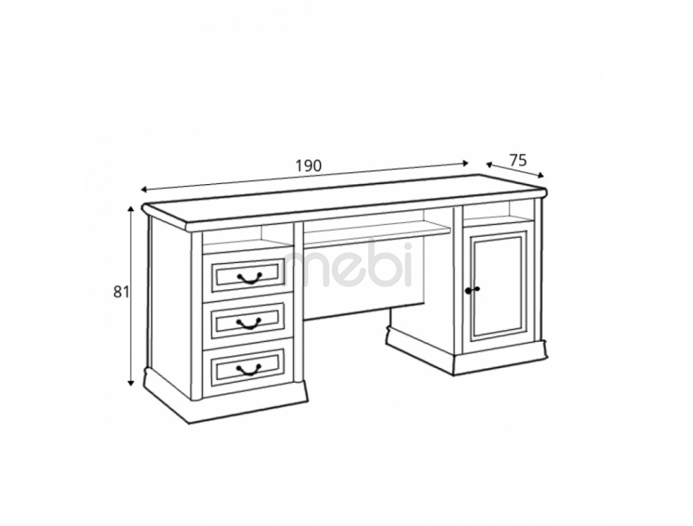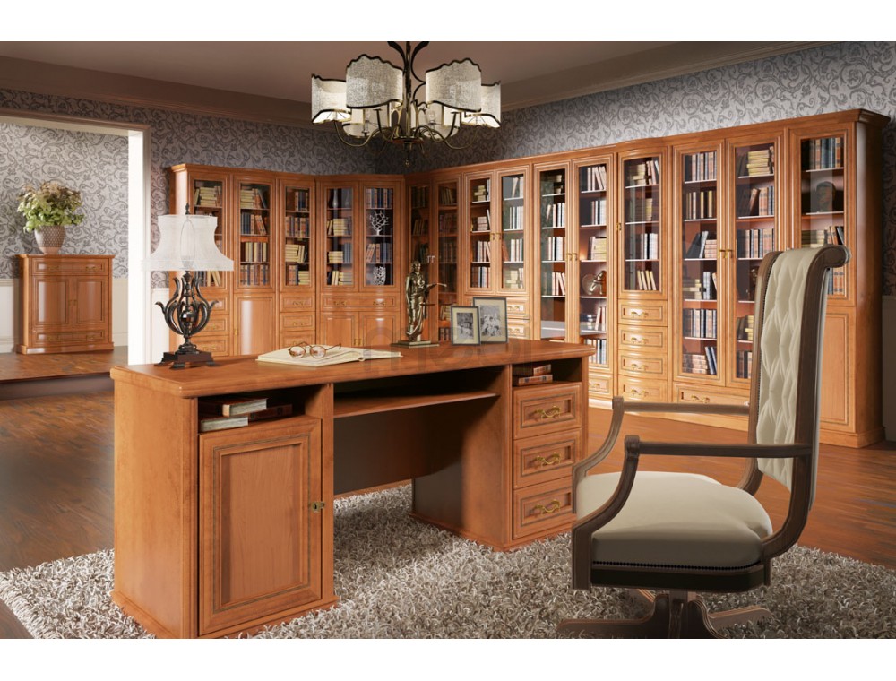 Стіл Rupert від Latzke — ідеальне місце для роботи в елегантно мебльованому офісі. Він гідно представлятиме вас і ваш будинок. Її обробка дуже елегантна, тому що меблі мають ручки красивої форми та декоративне різьблення, що проходить по всій лінії країв і фасадів. Цікавим рішенням є велика комплектація - з одного боку шафа, ящики і полиці, а з іншого ще дві шафи з виїмками. Завдяки цьому письмовий стіл Rupert вміщує безліч офісних приналежностей і його можна сміливо розмістити в центрі кімнати. Висока якість меблів забезпечується натуральною сировиною, з якої вони виготовлені.