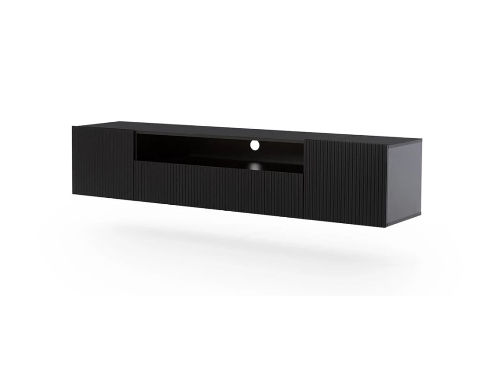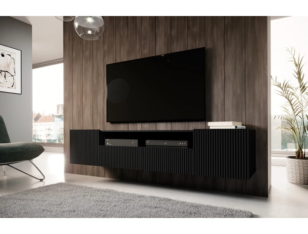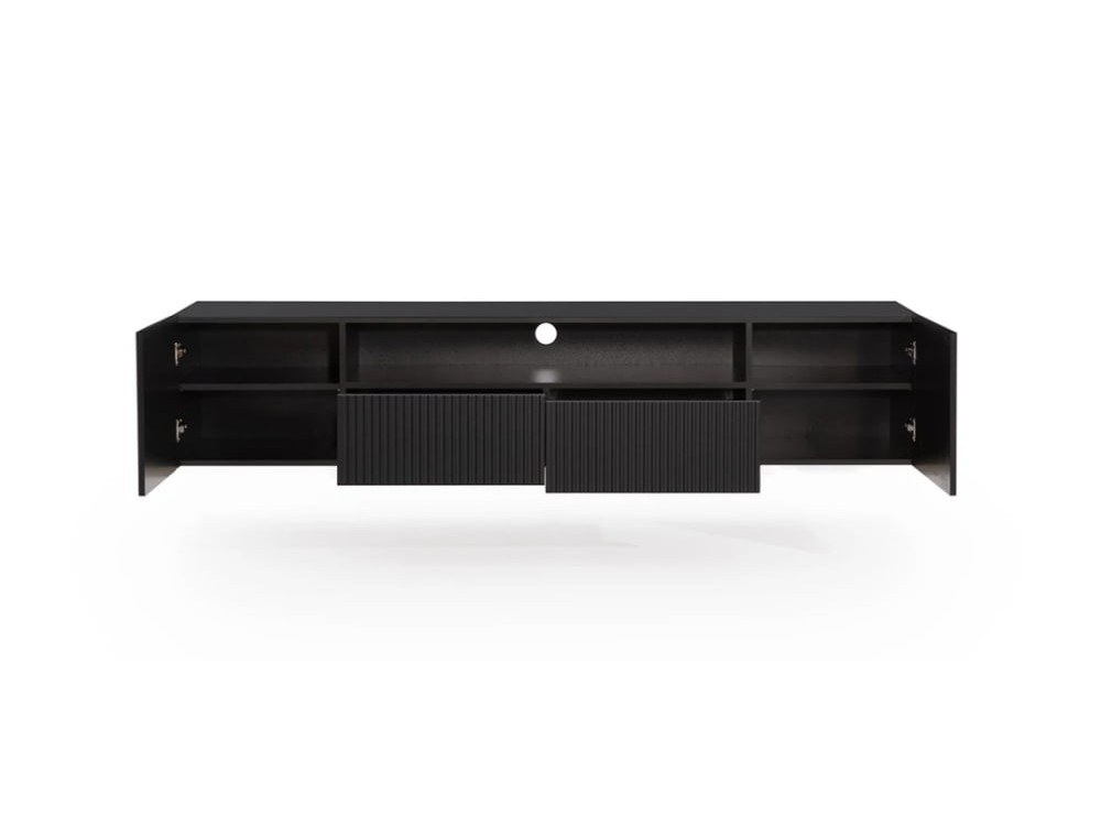 Підвісна тумба під ТВ з нішею з Ніколь, розміри 200х40х45 см. Шафа укомплектована двома шафами, що відкриваються, з полицями, і відкритим виїмкою (глибина виїмки без фасаду 40 см), під якою знаходяться дві висувні шухляди. Корпус і передня частина комода виготовлені з високоякісної МДФ плити товщиною 16 мм, задня частина корпусу - з ХДФ плити. Шафа відкривається за допомогою вищих фасадів. Блок також оснащений системою тихого закривання, яка дозволяє безшумно закривати двері та ящики.