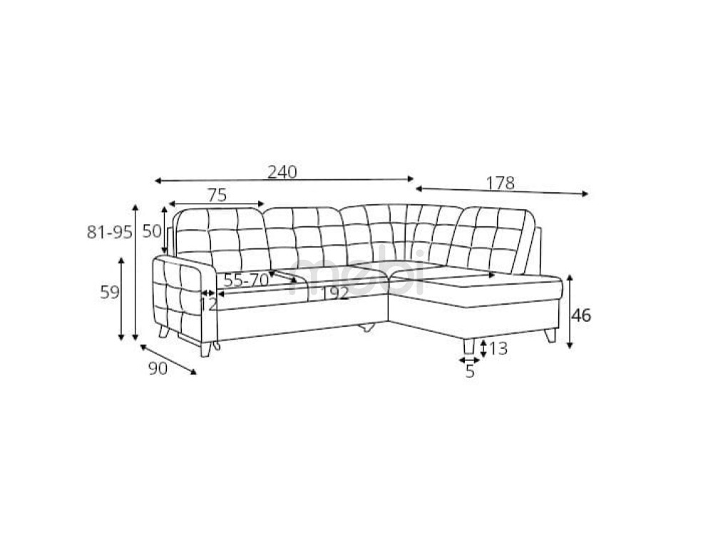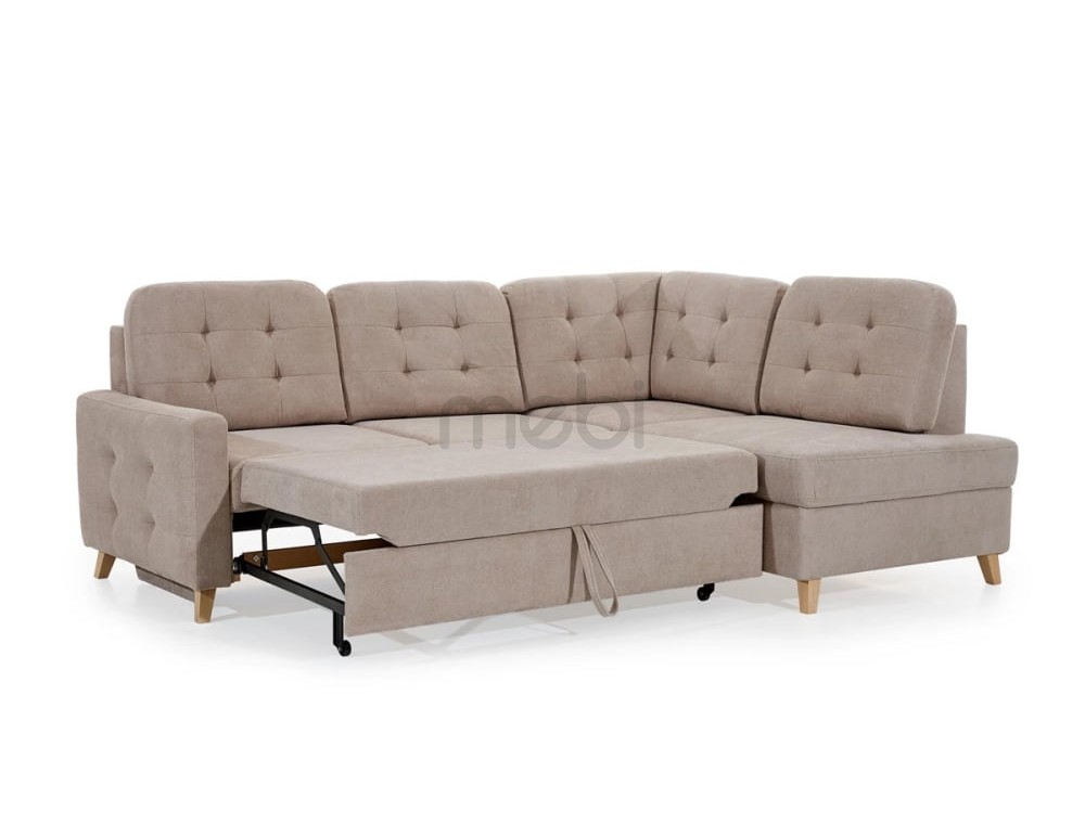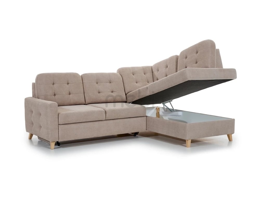 Кутовий диван Vanisa L з розмірами 240х95х178 см - це класична модель кутового дивана Г-образного типу, оснащена функцією спального місця дельфін зі спальною площею 205х139 см і контейнером для постільної білизни. Кутовий диван має п'ять великих подушок на спинку, які знімаються. Сидіння наповнене хвильовими пружинами, HR піною та пінополіуретаном. Всю конструкцію доповнюють дерев'яні ніжки, висотою 11 см. Модель доступна в широкій колірній гамі. Кутовий диван доступний в лівосторонньому і правосторонньому виконанні.