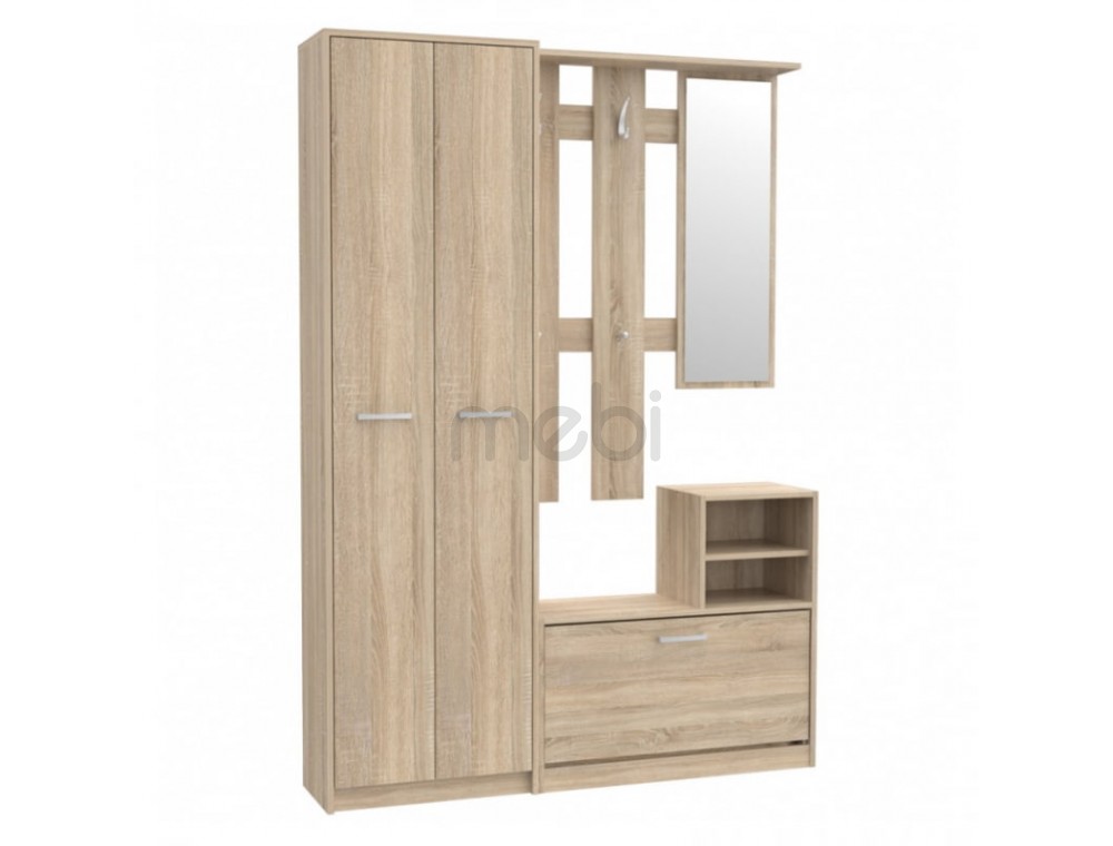 Передпокій Ніко від Forte - функціональний гарнітур, який можна використовувати в будь-якій квартирі. Модно оформлена передпокій складається з шафи, панелі з вішалками та полицею, вертикального дзеркала та тумби для взуття. У верхній її частині знаходиться відкрита шафа з горизонтальною полицею. Передпокій Ніко 01 виконана в модному кольорі - дуб сонома.