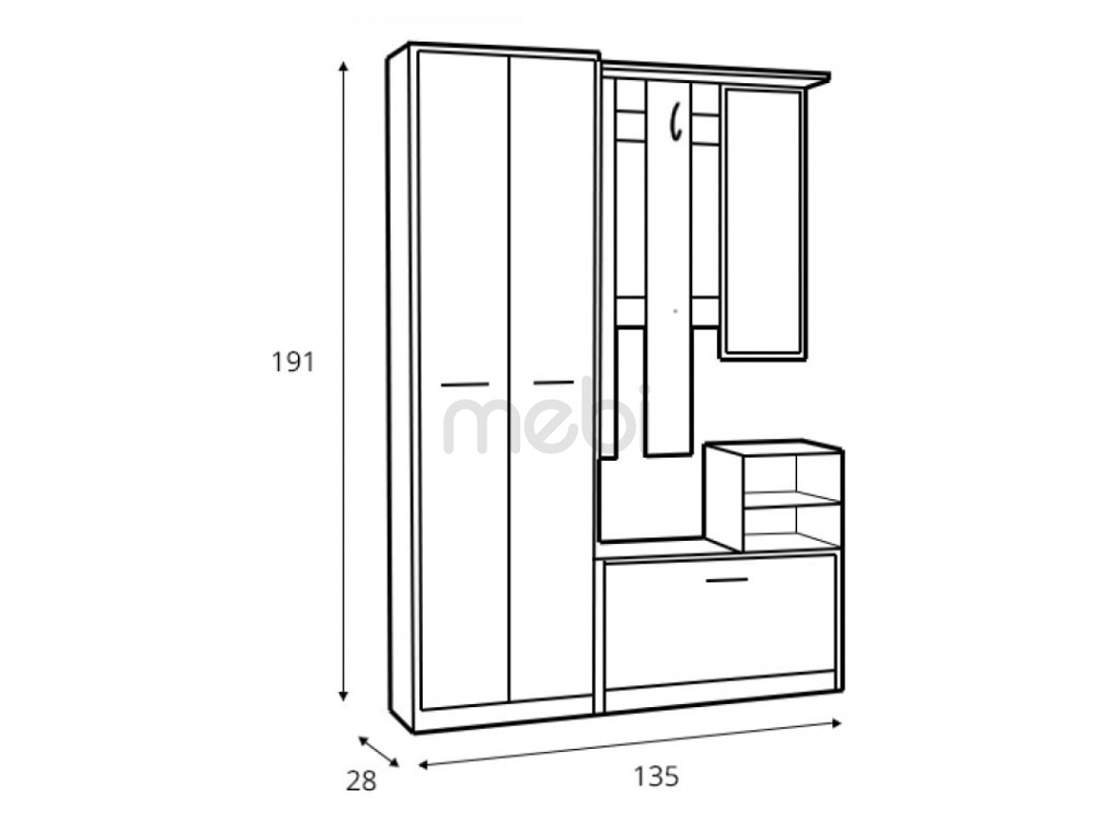 - передпокій складається з шафи, взуттєвої шафи, вішалки, дзеркала та тумби з горизонтальною полицею.