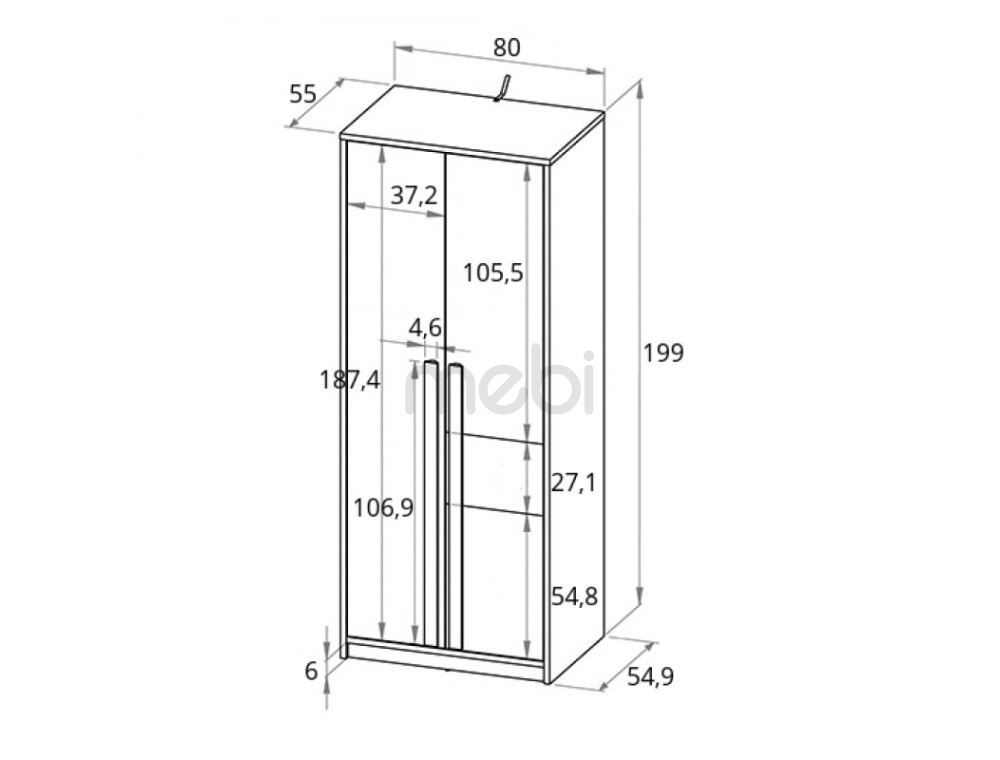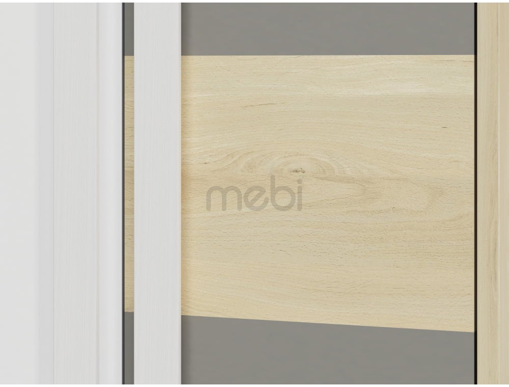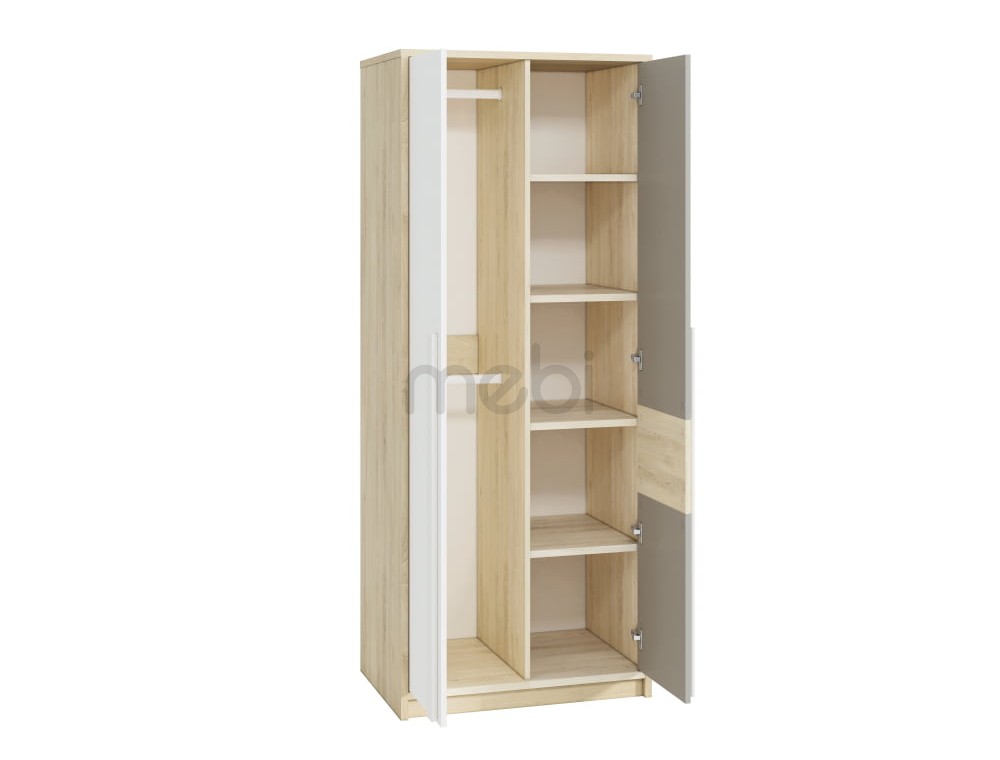 Шафа-купе від виробника ML Meble - це пропозиція як для кімнати дівчинки, так і для хлопчика. Корпус виготовлений з товстої ламінованої плити товщиною 22 мм, стійкої до пошкоджень і різних зовнішніх факторів. Краї, оброблені захисним ABS-шпоном, додатково збільшують довговічність конструкції. Внутрішня частина 2-дверної гардеробної Drop складається з 2 штанг зліва і 4 полиць для сортування одягу справа. Комфорт використання предметів меблів забезпечують довгі зручні дерев'яні ручки.