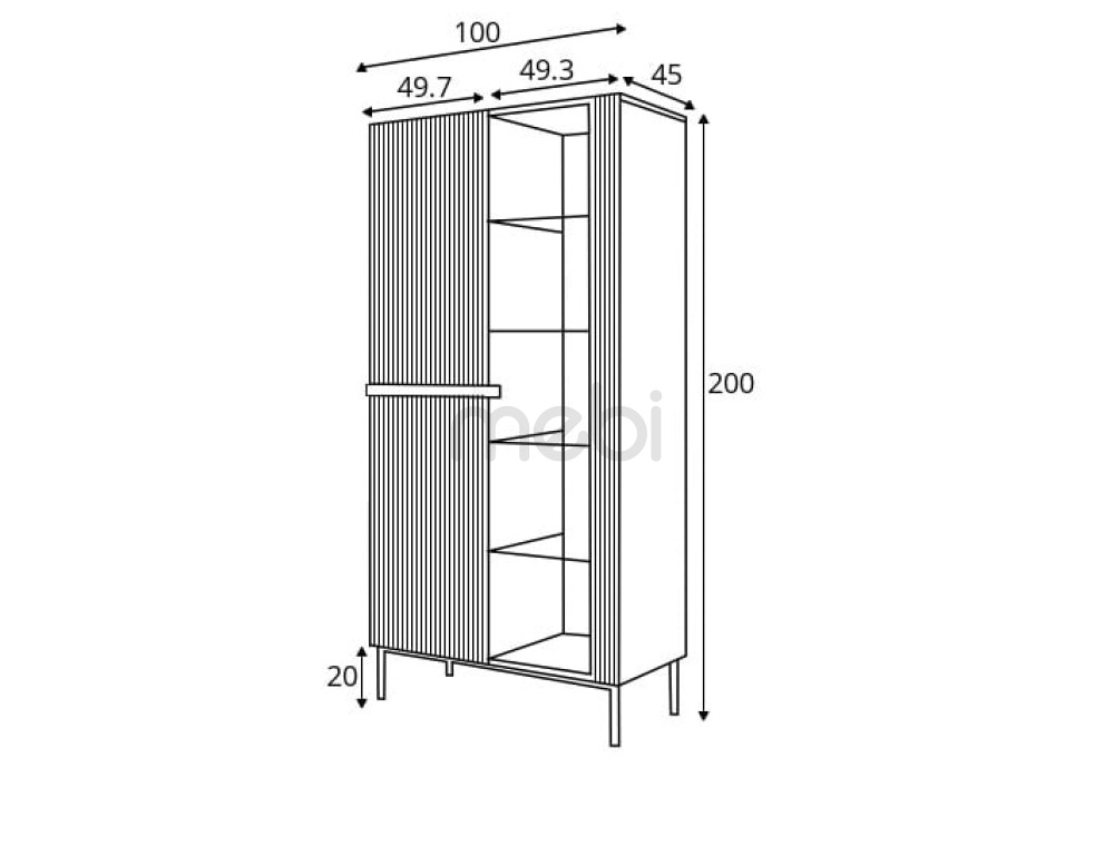 Шафа-вітрина Ніколь дводверна на вісім полиць, в тому числі чотири скляні, розміри 100х200х45 см (скло загартоване товщиною 4 мм). Форма та вся колекція характеризуються сучасним дизайном, що робить її надзвичайно привабливою порівняно з іншими колекціями. Корпус виготовлений з меблевої плити товщиною 16 мм, передня частина виготовлена з високоякісного МДФ товщиною 18 мм, задня частина корпусу виготовлена з HDF плити. Корпус оснащений металевою ручкою для зручного відкривання - золотого або чорного кольору в залежності від колірної комплектації. Шафа-вітрина оснащена петлями з безшумним механізмом закривання. Рифлені фасади і високі металеві ніжки висотою 20 см, доступні в золотому або чорному кольорі, доповнюють всю конструкцію (гумові накладки на ніжки).