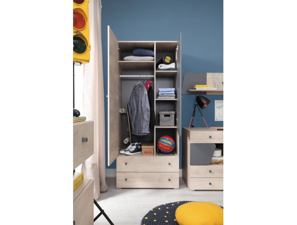Бажаєте облаштувати дитячу кімнату і радувати меблями роками? Виробник Meblar надає вам таку можливість. Колекція Delta - це меблі, які допоможуть вам обставити кімнату вашої дитини з раннього віку до підліткового віку. Універсальне поєднання естетичної імітації деревини дуба з ламінатом кольору антрацит дозволяє вписати меблі в кімнати різних колірних відтінків. Залежно від використовуваних аксесуарів кімната може придбати ніжний, дівочий або спортивний характер. У цій колекції ви знайдете, серед іншого: навісні полиці, комоди, стелажі, шафи, ліжка розміром 90х200, 120х200, тумба під телевізор, письмовий стіл.